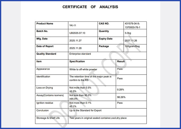 This product is available in liquid form.YK-11 is a synthetic compound classified as a selective androgen receptor modulator (SARM) with a unique molecular structure. Unlike most SARMs, it acts as a partial agonist of the androgen receptor and has a steroidal backbone, making it an interesting focus in muscle growth and bone health studies.